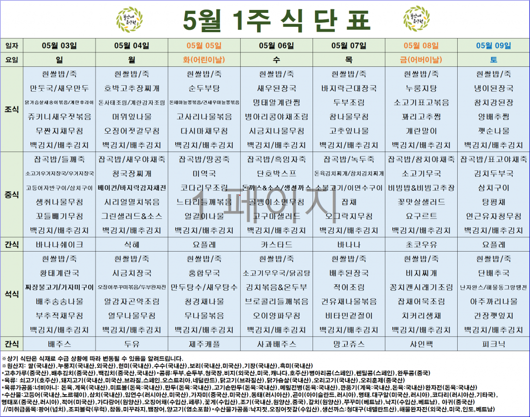 5월1주차 식단안내 입니다.